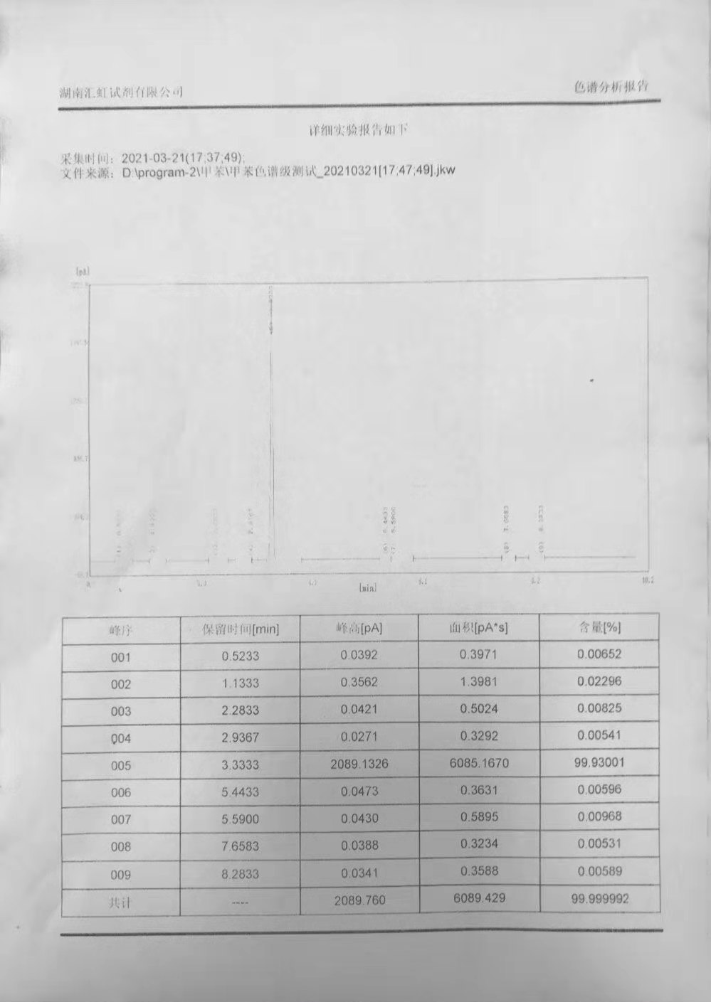 通過該設(shè)備對甲苯進行色譜分析的詳細實驗報告如下圖所示: